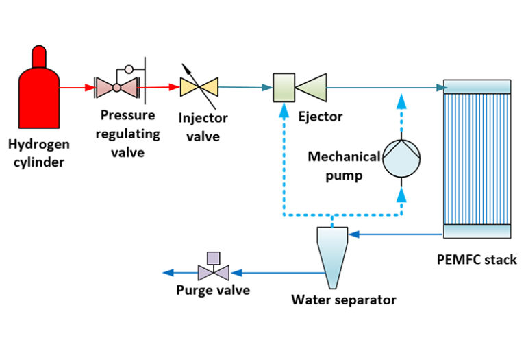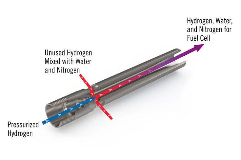 An example schematic showing how an eductor can be used to recirculate hydrogen in a PEM fuel cell system. (Image Credit)