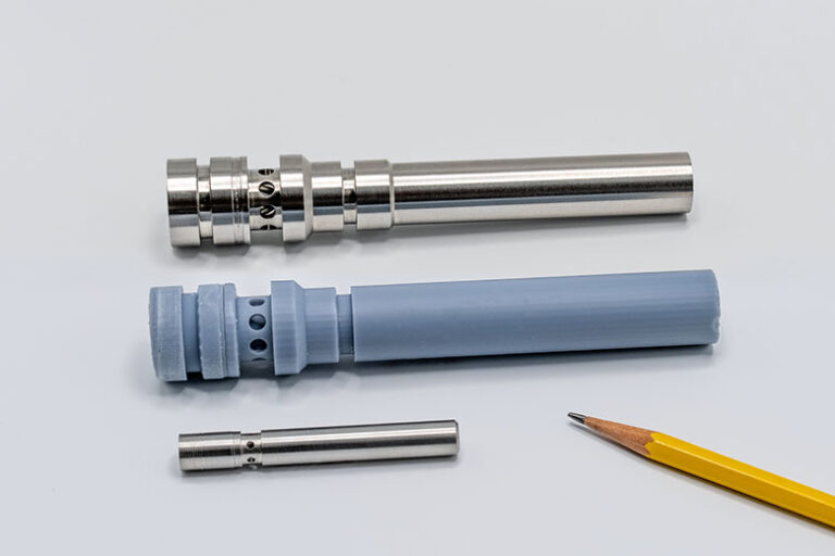 Shown top to bottom: a metal prototype, a 3D printed prototype, and a small-scale prototype used for bench testing.