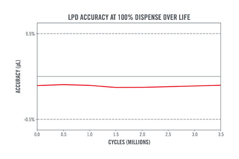 Figures 3 and 4 show how the LPD Series pump demonstrates consistent dispensing precision and accuracy across life on DMSO.