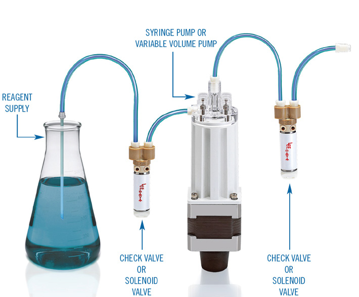Circuit 1 shows a reciprocating pump using two 2-way solenoid valves: one on the inlet and one on the outlet. In this case, the pump is aspirating the fluid from a reservoir and dispensing to a point of interest. The dispense tip could also move, allowing multiple dispenses across titer plates, past detectors, or to waste. Alternatively, the circuit could use a 3-way valve on the inlet to allow the optional supply of a cleaning agent through the flow path.