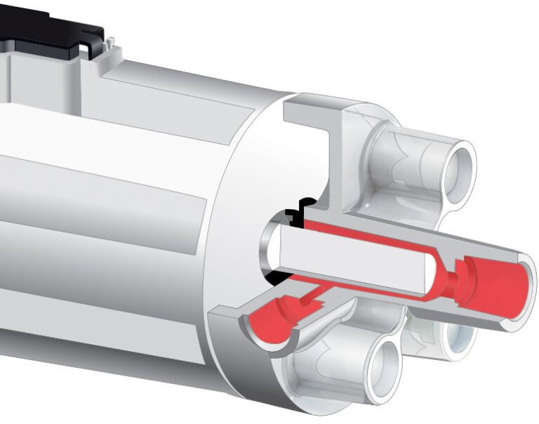 A pump’s internal volume is held within the port head or syringe and can affect a variety of system functions. The image to the left shows the internal volume of a pump’s port head in red. When priming the pump, all air bubbles must be purged out of the pump’s internal volume. Any air left in the pump can lead to erratic dispense accuracies. Pumps with larger internal volumes may require many priming cycles to ensure all air is out of the pump, which should be accounted for during instrument initialization. Also, the internal volume of reciprocating pumps is not always fully purged with each dispense, so applications that are sensitive to cross contamination may require buffer fluids to keep the sample fluid out of the pump. Internal volume that cannot be easily flushed out is often referred to as dead volume. Even when cleaning cycles are run, a pump’s dead volume may not be completely flushed out.