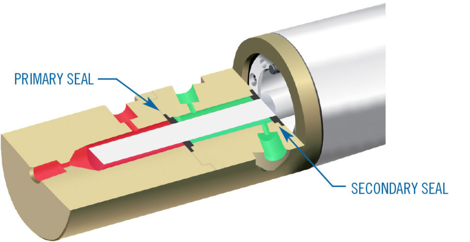 Some fluids may not chemically attack a pump but will cause physical issues. When using fluids that are prone to crystallization, the crystals can damage seals in reciprocating pumps which can lead to leakage-related failures. Other fluids that contain surfactants, which lower surface tension, tend to slip past the seals of a pump. A secondary seal may be used with the pump to mitigate these issues. Between the seals, an intermediate fluid can prevent crystallization and dilute surfactants, greatly extending the pump’s cycle life. The below image shows a cross section of a dual seal port head configuration.