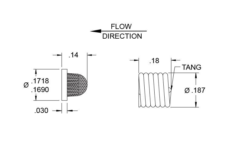 This etched last chance filter features a seamless, one-piece screen element formed with pleats to greatly increase contamination carrying capacity. The result is a robust screen design with an optimum amount of protection in a small package. It is offered with several standard hole size options ranging from 75 to 500 microns. This version incorporates a simple flange mount with a retention spring, a combination which provides for an inexpensive mounting technique suitable for unidirectional flow. The spring OD is slightly larger than the ID of the mounting hole and a special tool is used to twist the spring into the hole. Once the tool is removed, the spring holds the screen in place.