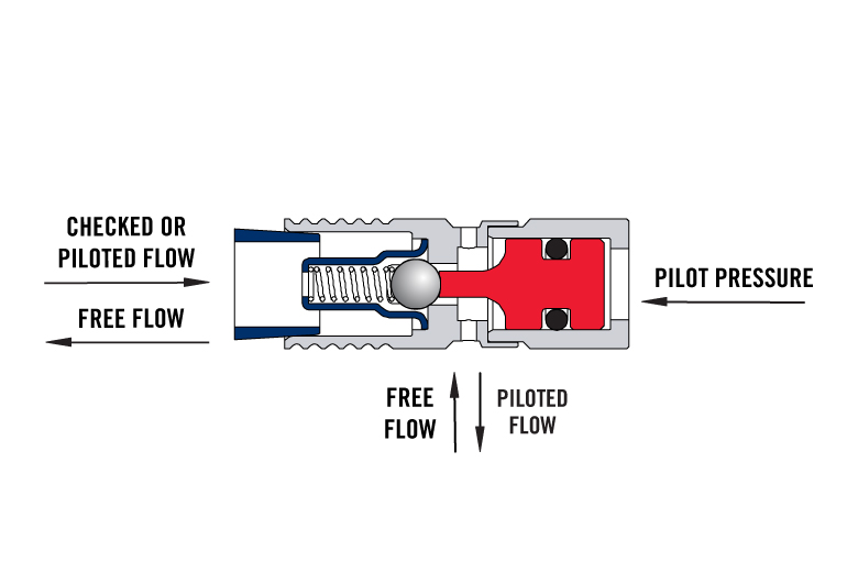 This threadless, cartridge-style, check valve is designed with an integral piloting piston to enable piloted actuation. It acts as a check valve under normal conditions, and when pilot pressure is applied to Port B it opens the valve to allow flow from Port A to Port C. Rugged construction and is 100% performance-tested to ensure consistent operation over time. This 5.5 mm check valve features The Lee Company’s field-proven locking end that provides retention into metal manifolds without the use of threads, O-rings, or sealants.