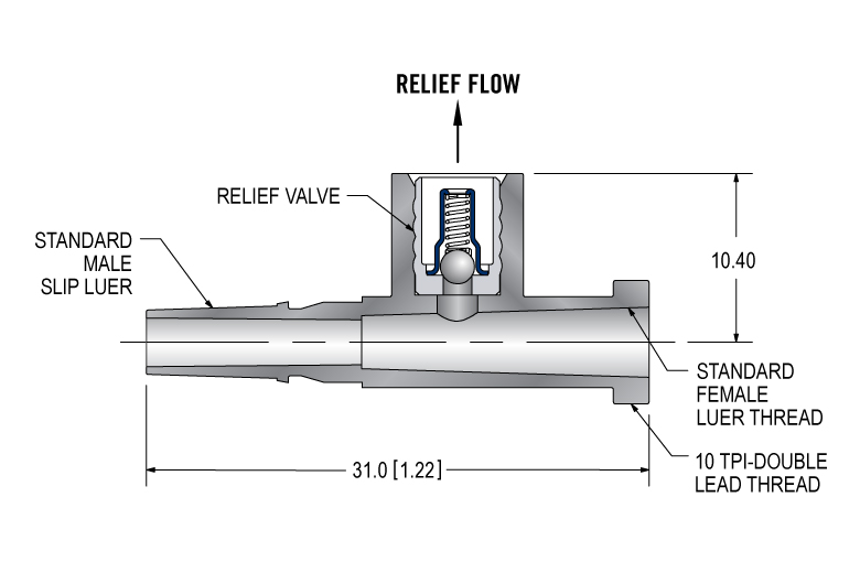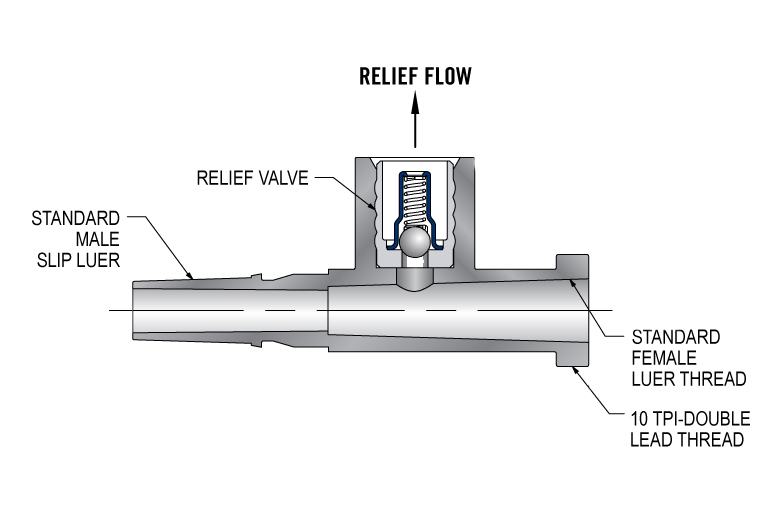 This direct-acting cartridge safety pressure relief valve is installed into the branch of a Luer Tee fitting, making it ideal for syringe-driven systems where a maximum force is required. The 5.5 mm diameter valve features all stainless steel construction and is compatible with a wide range of fluids and gases. The fitting is made from medical grade polypropylene. A high quality metal seat provides low leakage, repeatable cracking pressure, fast response time, low hysteresis, and long life. The valve is 100% functionally tested to ensure performance.
