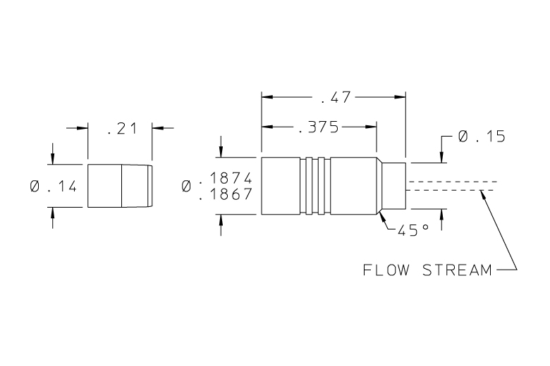 This lubrication jet generates a straight, well-defined stream of fluid to a predetermined target with differential pressures of 10 to 200 psid. It is ideal for directing streams of lubricating oil at critical bearings, cooling oil at meshing gears, or fuel at the inside of vaporizing tubes in aircraft combustion chambers. Forward Screened Lubrication Jets are offered with a ± 10% tolerance and are available in a Lohm range from 500 to 7500 Lohms. An integrated safety screen is included for protection against rogue particles in the forward flow direction.
