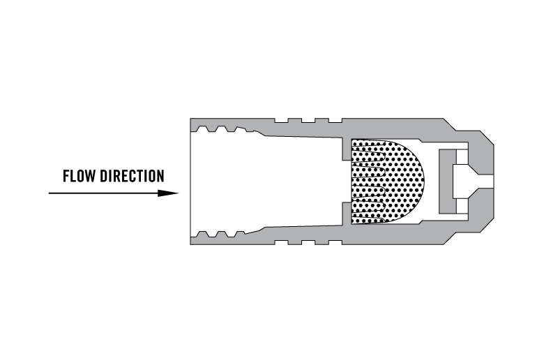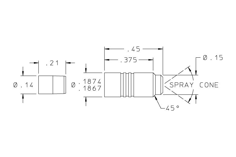 This nozzle utilizes unique vortices and flow passages to provide a finely atomized, hollow cone spray pattern. When used with most fuels, Lee Spin Jets produce a 70° cone angle spray with differential pressure ranging from 50 to 200 psi. For liquids with surface tension between 0.002 and 0.005 lb/ft, the resulting droplet size is typically less than 150 microns. Four convenient part numbers are available, spanning from 6000 to 18,000 Lohms. Each nozzle is equipped with a safety screen to protect against rogue particles.